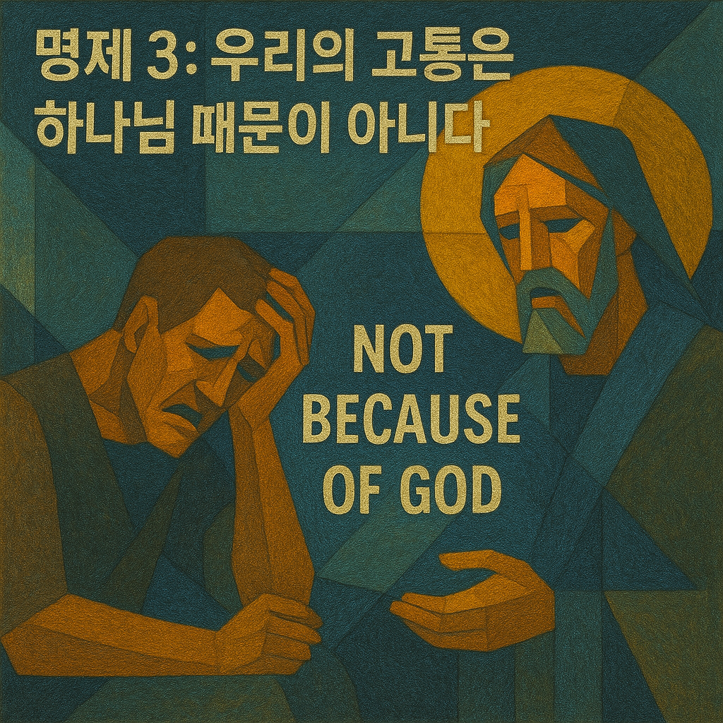 고통은 단순히 인간의 선택이나 세상 상태에서만 기인하는 것이 아니라, 하나님의 창조, 섭리, 또는 허락과 관련될 가능성이 있으며, 이는 “우리의 고통은 하나님 때문이 아니다”는 주장을 부정합니다. 따라서 이 명제는 기독교 신앙과 논리적으로, 실천적으로 타당하지 않습니다.