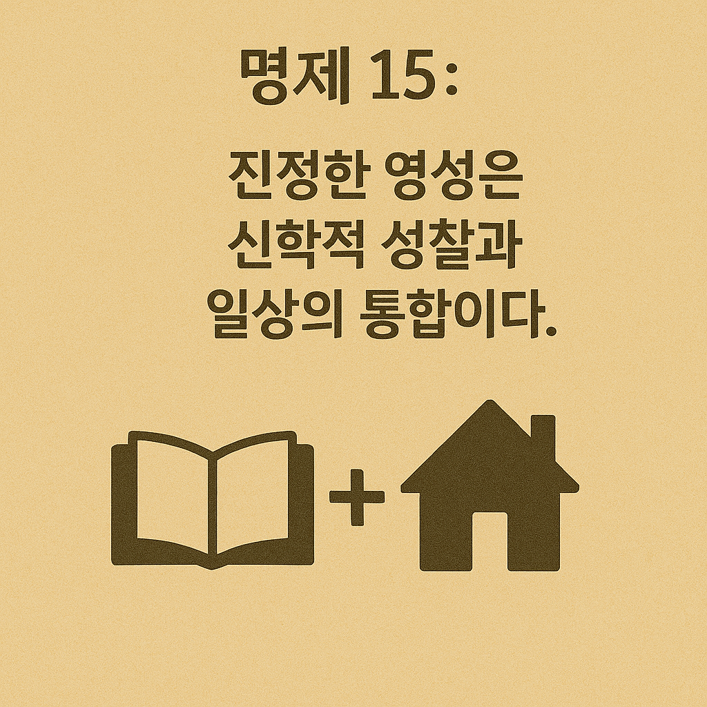 진정한 영성은 신학적 성찰과 일상의 통합입니다. 이 통합을 통해 우리는 하나님을 깊이 알며, 참된 영성을 완성합니다.