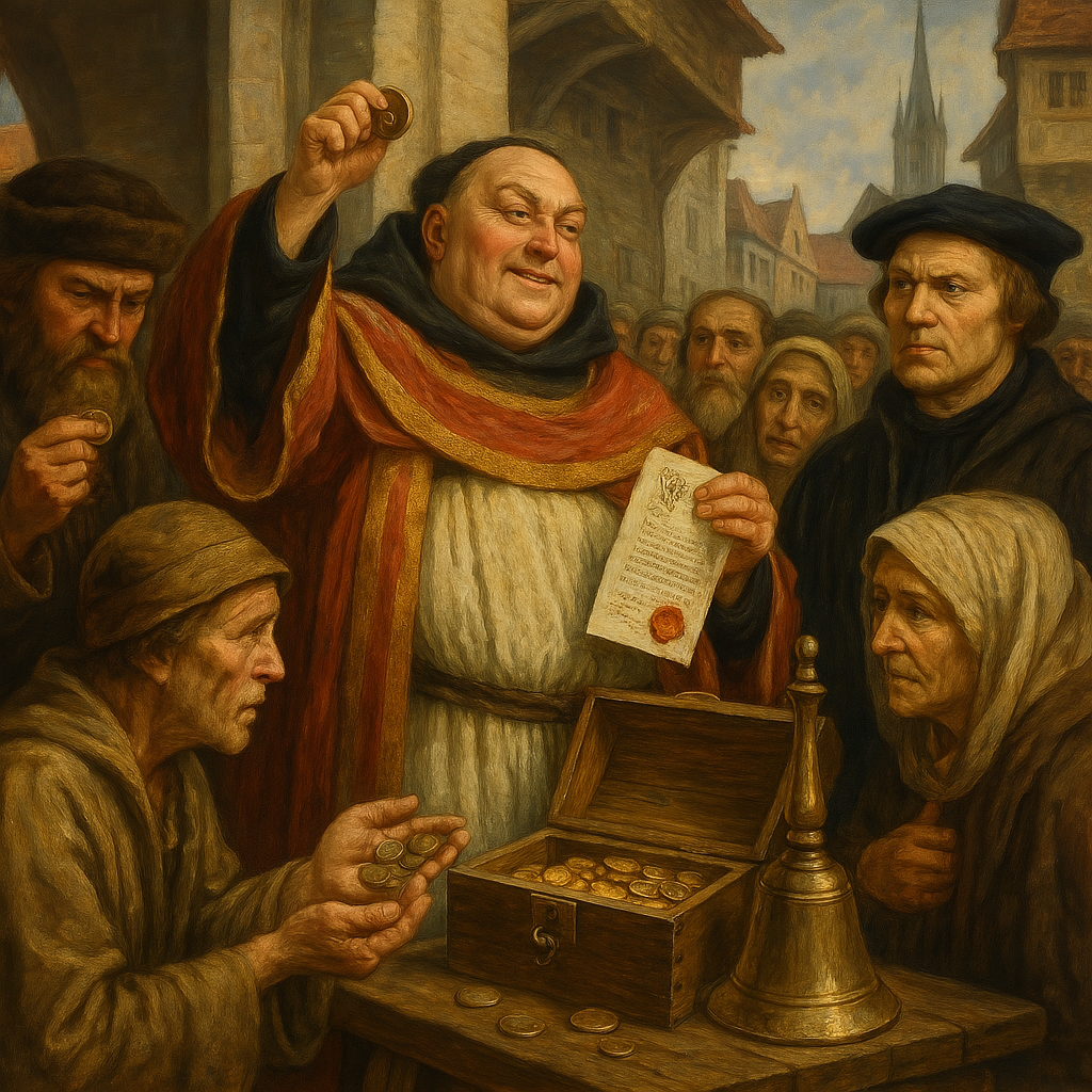 16세기 초, 유럽의 마을 광장과 교회 앞은 낯선 소리로 가득했다. 종소리가 울리면 면죄부 판매원의 목소리가 뒤따랐다. “이 종이 한 장으로 지옥의 문이 닫힙니다! 동전을 내세요, 천국이 열립니다!” 가난한 농부는 손바닥에 땀을 닦으며 동전을 내밀었고, 부유한 상인은 금화를 쌓아 올렸다. 교황청은 로마의 성 베드로 대성당을 새로 짓기 위해 막대한 자금이 필요했다. 면죄부는 그 돈을 끌어모으는 도구였다. 그러나 이 제도는 백성의 신앙을 이용한 사기였고, 결국 마르틴 루터와 같은 이들의 저항으로 무너지기 시작했다.