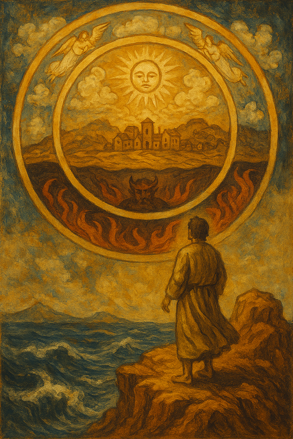 고대 세계의 세계관은 삼층 우주론으로 대표된다. 이는 세상을 하늘(신적 영역), 땅(인간 영역), 지하(죽음과 악의 영역)로 나누는 공간적 구조다. 신약성경은 이 우주론을 자연스럽게 반영한다. 예수의 승천(사도행전 1:9-11)은 하늘로 올라가는 이미지로 묘사되며, 바울은 "하늘과 땅과 땅 아래 모든 무릎이 예수께 꿇을 것"(빌립보서 2:10)을 언급한다. 요한계시록의 천사와 용의 싸움(요한계시록 12:7-9)은 하늘과 지하의 대립을 상징한다. 이 삼층 구조는 유대교의 구약 전통(창세기 1:6-8, 하늘과 땅의 창조)과 헬레니즘의 다층적 우주론에서 비롯된 것으로, 당시 사람들에게는 물리적 현실이자 신학적 틀이었다.