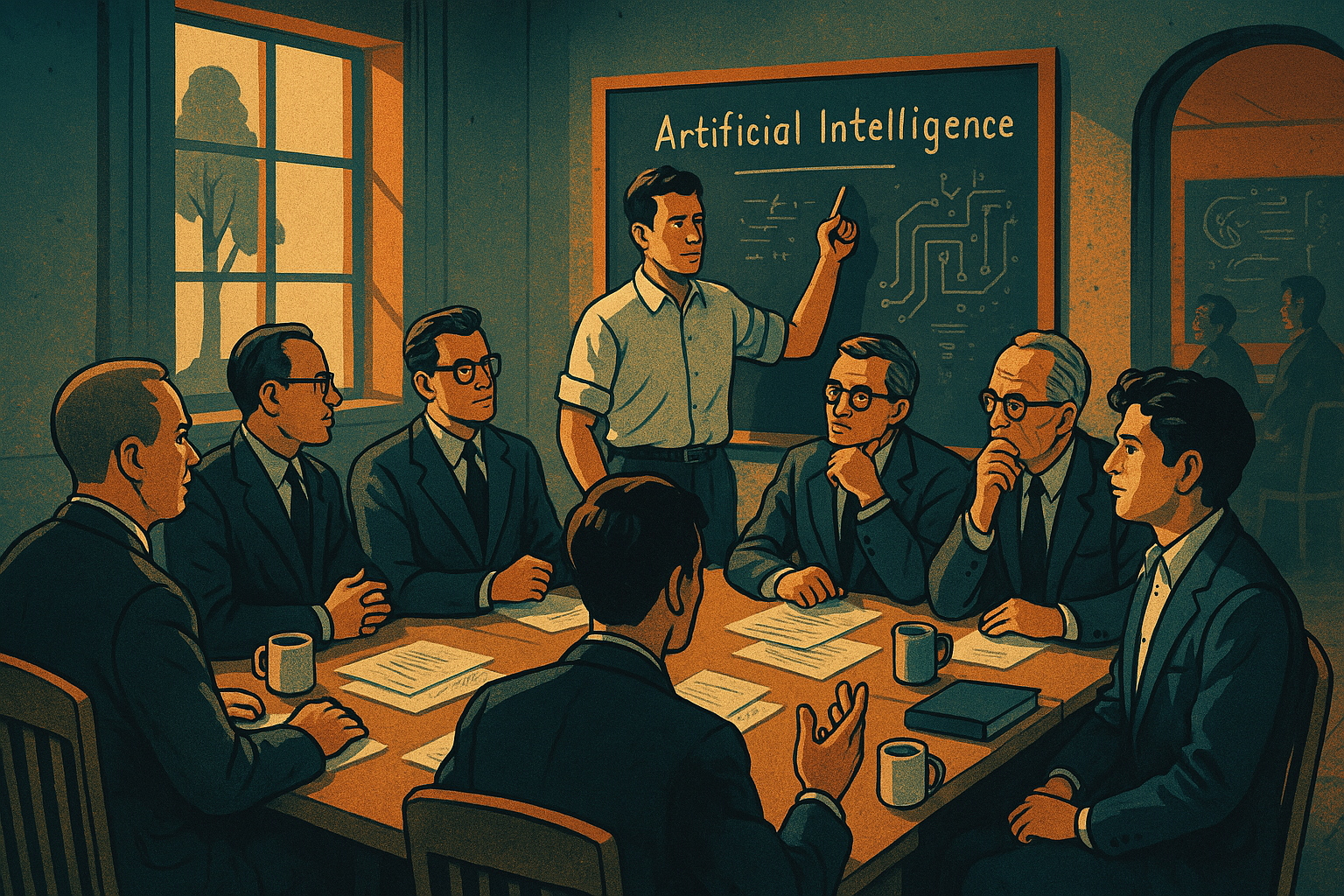 1950년대 중반, 컴퓨터는 오늘날 우리가 아는 것과는 전혀 달랐다. 진공관과 릴레이로 작동하는 IBM 701 같은 기계는 방 하나를 가득 채웠고, 초당 수백 번의 연산을 수행하는 데 그쳤다. 프로그램은 천공 카드로 입력되었고, 저장 장치는 자기 테이프에 의존했다. 이런 환경에서 기계가 언어를 이해하거나 창의적 문제를 해결한다는 발상은 터무니없어 보였다. 그러나 다트머스에 모인 이들은 한계를 뛰어넘는 상상을 현실로 만들고자 했다. 회의는 매일 아침 9시경 시작되어 밤늦게까지 이어졌다. 참가자들은 낡은 나무 책상에 앉아 커피를 마시며, 칠판에 수식과 다이어그램을 그려 넣었다. 토론은 때로 격앙되었고, 때로 웃음으로 마무리되었다. 그들은 단일한 목표 아래 뭉쳤지만, 접근법은 제각각이었다.