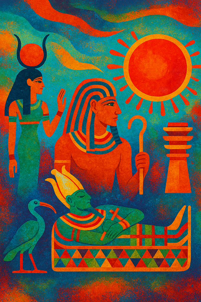 오시리스 신화는 '죽음과 부활의 원형'으로, 엘리아데는 세트(Seth)의 살해, 이시스(Isis)의 부활 의식, 호루스의 복수를 "자연 순환과 왕권 승계의 상징"으로 해석합니다. 오시리스 신화는 이집트 종교의 중심이며, “죽음의 제의화”의 완성입니다. 세트(Set)에 의해 살해된 오시리스는 이시스의 애통 속에서 부활하며, 부활의 원형이자 사후 세계의 왕이 됩니다. 오시리스는 무기력한 죽은 왕으로 묘사되지만, 호루스의 눈(Wedjat)을 통해 재생되어 식물적·생식적 에너지를 부여합니다. 엘리아데는 이 이야기를 메소포타미아의 두무지 신화와 비교하며, 연례 축제(Osiris mysteries)에서 슬픔과 기쁨의 교대가 드러난다고 지적합니다. 그는 이를 “영원회귀의 내면화”라 부르며, 이집트 종교가 죽음을 통해 영원을 긍정하는 최초의 사유 체계를 만들었다고 해석합니다. 오시리스는 왕의 모델로, 파라오가 그의 죽음을 재현함으로써 왕국의 번영을 보장합니다.